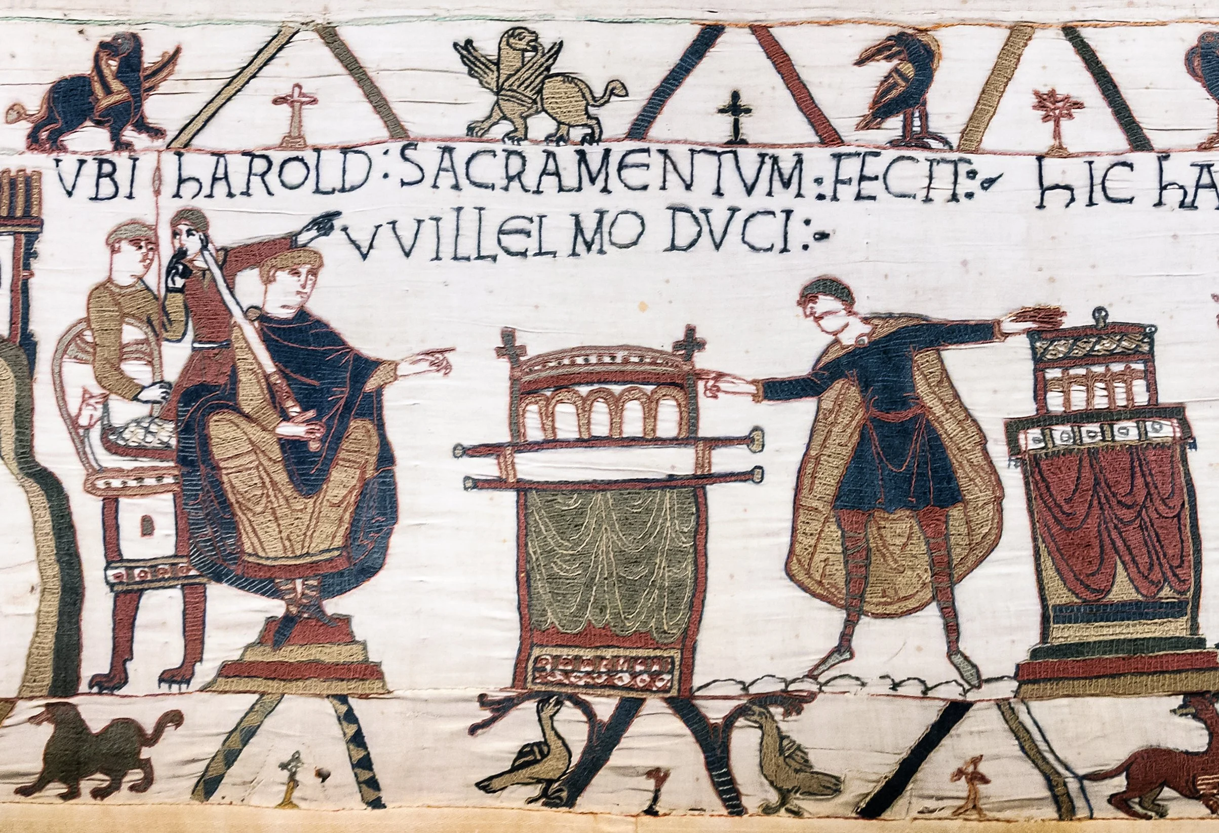 Bayeux Tapestry : Scene 23: Harold swearing oath on holy relics to William, Duke of Normandy. Wikimedia Commons.